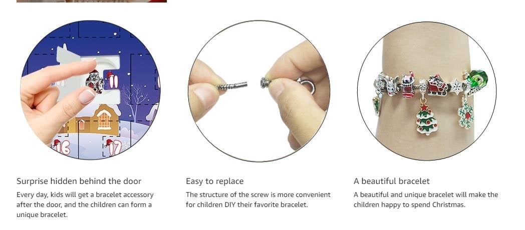 - A Christmas advent calendar with 22 Charm Beads and 2 Bracelet Chains to make 2 Christmas bracelets