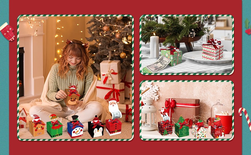 The money holders for Christmas in the set exhibits festive patterns such as penguin and gingerbread men, amongst others; The festive colors further accentuate their festive appeal, making these boxes not only a containment for gift giving, but also a decorative Christmas element
